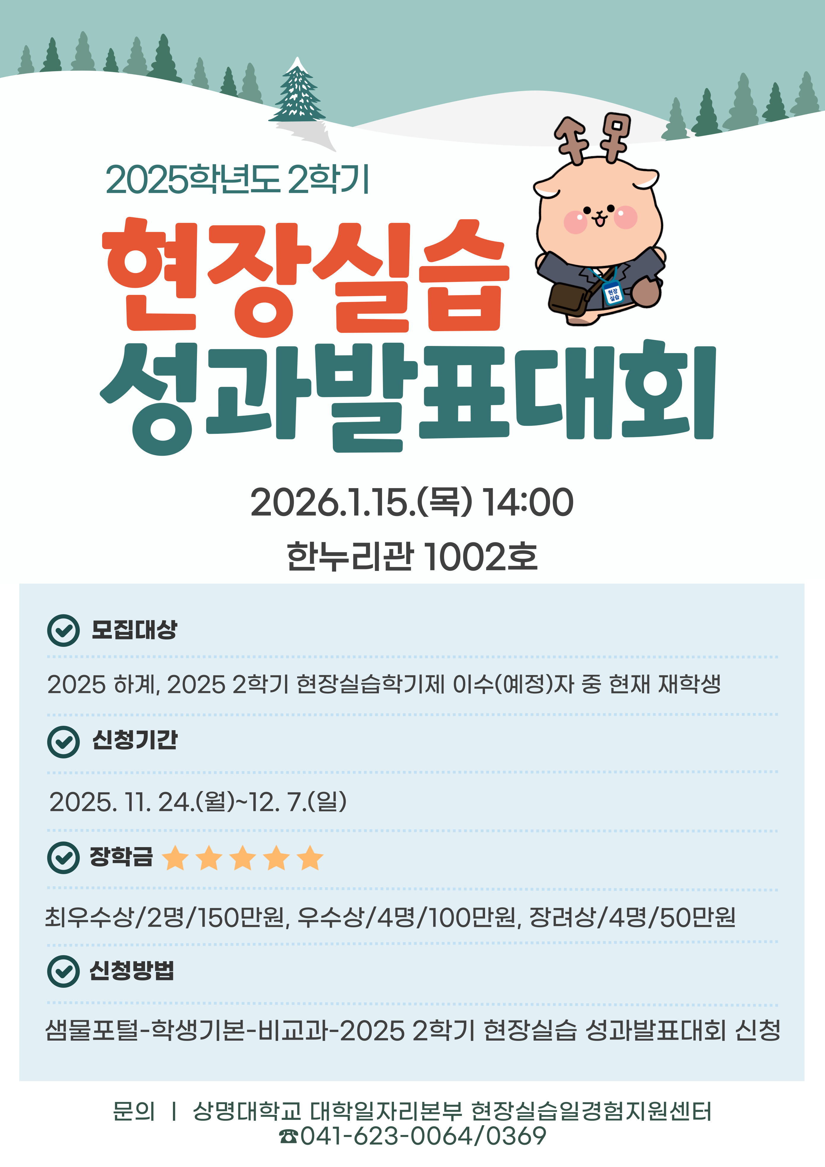 천안 [진로취업] [현장실습·일경험지원팀(천안)] 2025학년도 2학기 현장실습 성과 발표 대회 시행 안내 -